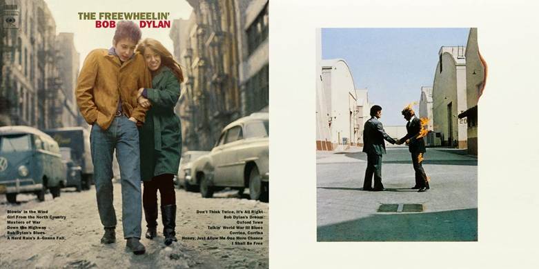 Ci sono poi delle ispirazioni d’autore: la copertina di The Freewheelin’ Bob Dylan [l’abbiamo raccontata qui] uscita oltre trenta anni prima e Wish you where here dei Pink Floyd, anche qui con due misteriosi uomini in copertina.
