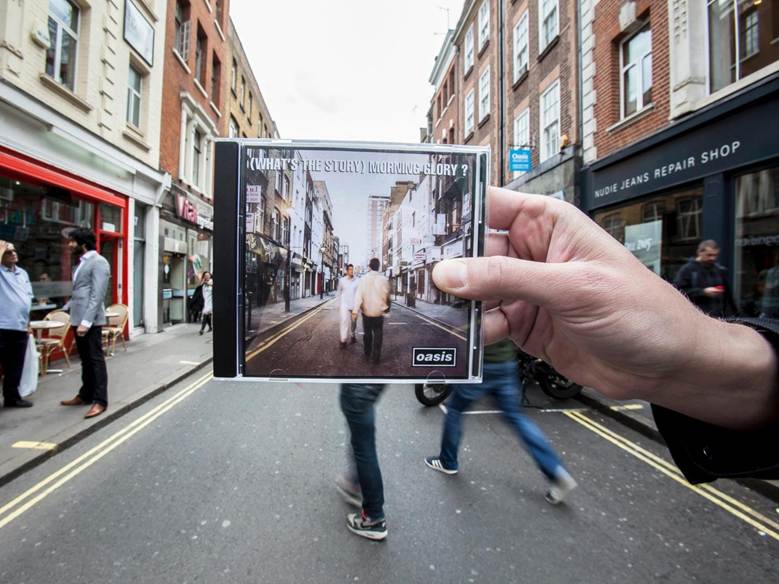 Ma se notate bene c’è una terza persona nella copertina di (What’s the story) Morning Glory. Sullo sfondo si vede un uomo che tiene in mano un disco tutto bianco. Si tratta di Owen Morris, il produttore dell’album, che tiene in mano il master del disco appena inciso – leggenda vuole che se lo sia portato dietro per tutta la serata rischiando di perderlo!