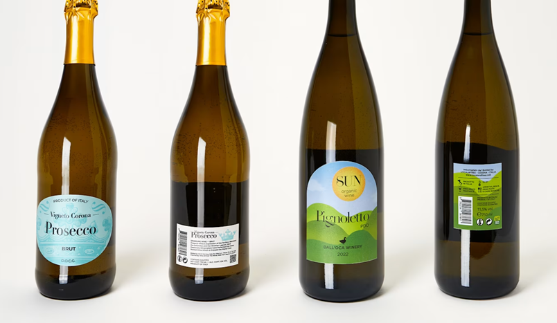 Le bottiglie di spumante e Champagne introducono un’altra variabile: la curvatura. Le superfici bombate richiedono etichette più compatte e materiali più resistenti, soprattutto se il prodotto è destinato a essere conservato in ambienti umidi.