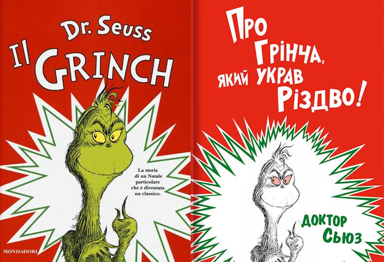 Ma la prima copertina de Il Grinch rimane la più amata, anche nelle edizioni internazionali. Qui, ad esempio, un’edizione italiana e una dall’Ucraina. Se notate bene, la prima mostra il Grinch verde, l’altra no. Voi come lo preferite?