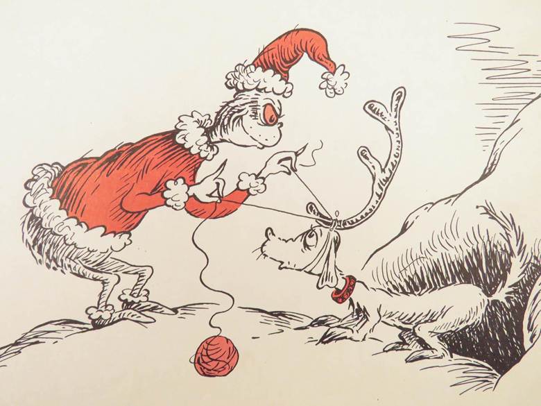 Nella copertina della prima edizione del libro, il Grinch non ha la pelle verde come siamo abituati a conoscerlo. Né la creatura è verde all’interno del libro, dove gli unici colori presenti sono il rosso e il bianco. Dr. Seuss disegnò l’essere anti-natalizio bianco e con gli occhi rosacei.