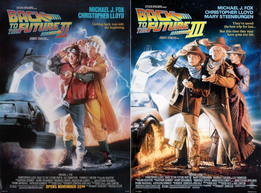 Drew Struzan disegnò anche le locandine dei successivi due capitoli che compongono la trilogia di Ritorno al futuro, usciti rispettivamente nel 1989 e nel 1990. L’impostazione grafica riprende fedelmente la locandina iniziale, ma qualche “dettaglio” diverso suggerisce le nuove ambientazioni temporali del film: il futuro e il West! Compaiono poi finalmente i co-protagonisti, tra cui l’amatissimo scienziato Doc (interpretato da Christopher Lloyd).