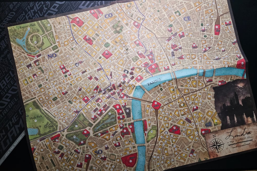 - Mappa di Londra: mostra la città com’era alla fine dell’800, divisa in 5 quartieri, e serve per orientarsi, partendo dal luogo del delitto fino ad arrivare ai luoghi di interesse per l’indagine.