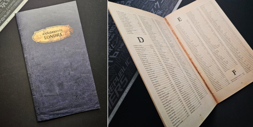 - L’Annuario di Londra: si tratta di un semplice elenco di tutti i personaggi che è possibile incontrare e il luogo dove trovarli. Funge da raccordo tra la mappa e il libro del caso da risolvere.