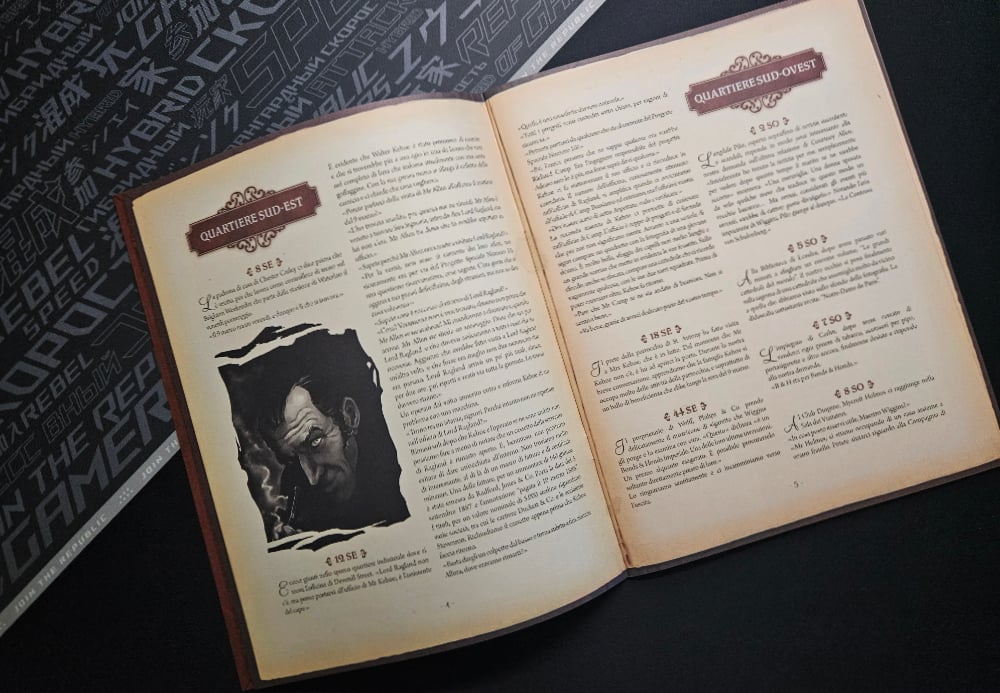 - Regolamento: è un volumetto di poche pagine dove sono spiegate le regole del gioco e l’ambientazione. Qui è presente la lista degli informatori, molto utili per lo svolgimento della partita.