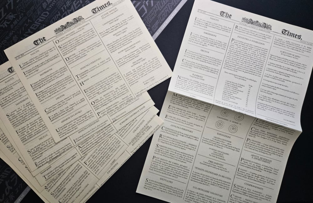 - 10 quotidiani: sono i giornali del Times, stampati su fogli che simulano un quotidiano dell’epoca. Qui ci sono informazioni legate ai casi, da poter scovare con intelligenza e deduzione, dato che sono presentati sotto forma di articoli di cronaca.