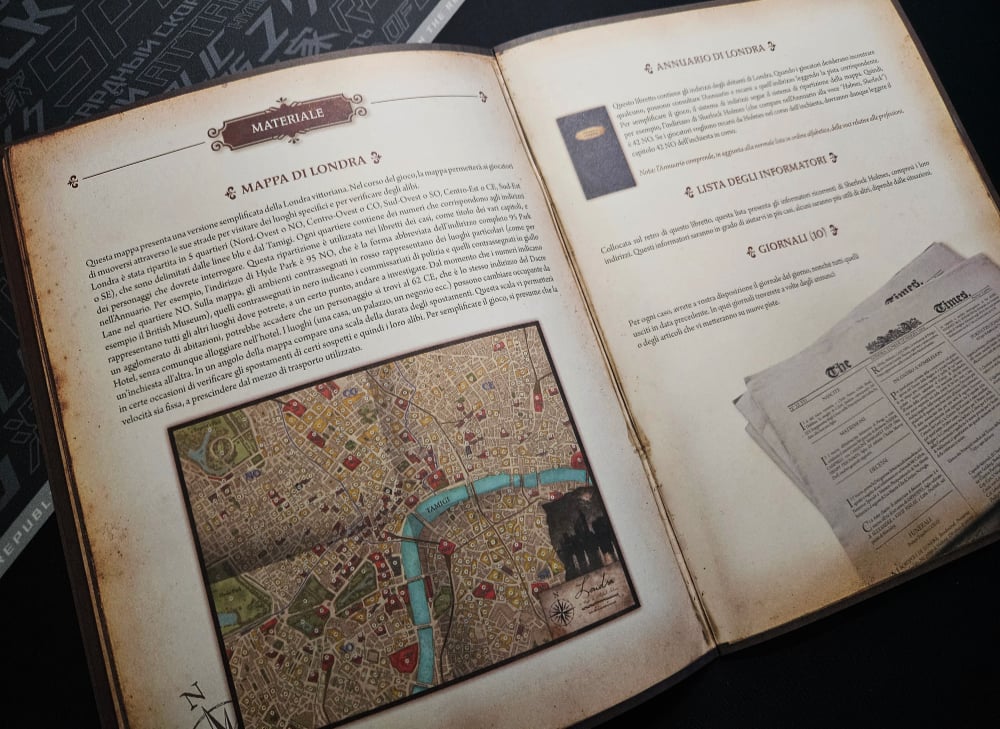 - Consultazione dei materiali cartacei: i giocatori usano l’Annuario per trovare l’indirizzo di una persona o di un’attività, oppure cercano un luogo direttamente sulla Mappa di Londra, organizzata in punti cardinali. Potrebbero anche decidere di leggere il giornale del giorno per cercare indizi.