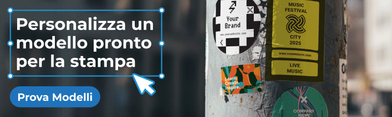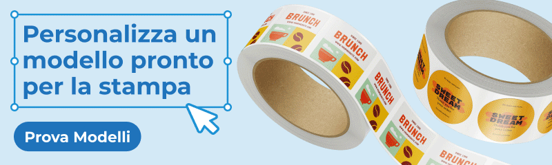 Puoi scegliere formato, materiale, forma e finiture direttamente sul sito di Pixartprinting nella categoria Etichette e adesivi, caricare il tuo file grafico oppure utilizzare i template personalizzabili e completare l’ordine in pochi click.
